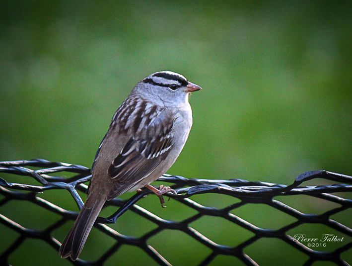 Ce grand bruant élégant est peu fréquent sous nos latitudes en été car il préfère nicher plus au nord, dans les régions boréales, subalpines et alpines. C'est au printemps et en automne qu'on peut avoir le loisir de l'observer, durant sa migration. Pratiquement toujours au sol, il sautille dans l'herbe le long des buissons à la recherche d'insectes et de graines. Le chant peut se faire entendre au printemps. C'est un sifflement mélodieux qui se termine par un trille: «Veux-tu du poulet frit?». Les deux sexes sont identiques: couronne de bandes noires et blanches, bec rose, dos brun strié et dessous gris uni. La gorge est plus blanchâtre que le reste. Le jeune a une couronne brune et blanche.